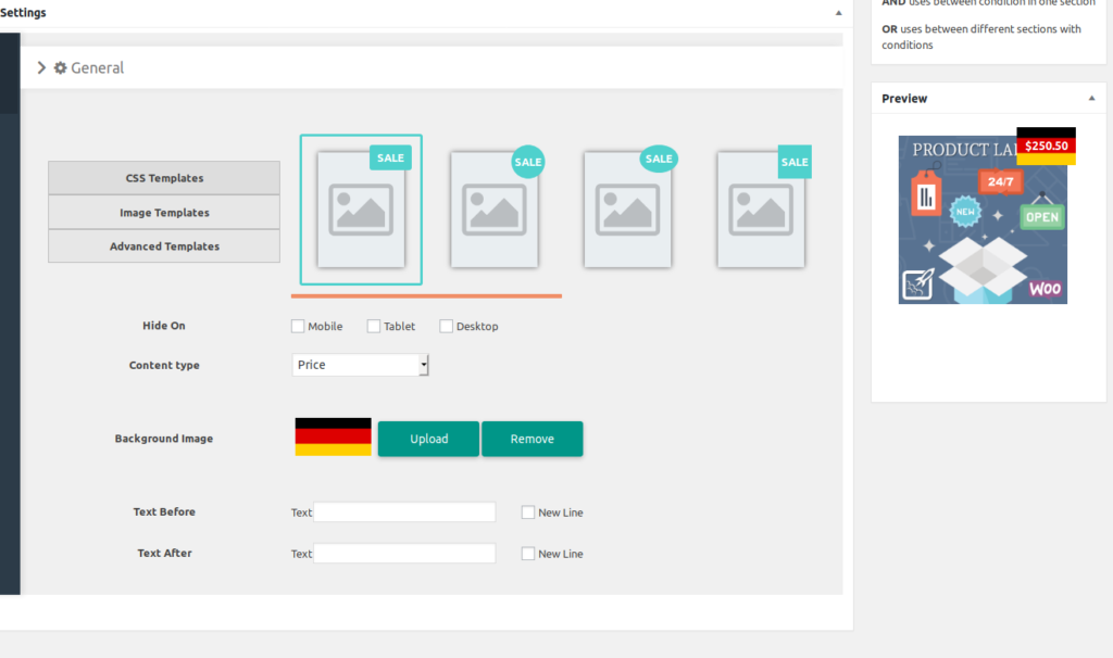 Labels can be applied based on a wide range of conditions such as product category, price, sale status, stock status, bestseller ranking, or custom attributes, enabling precise targeting. The plugin supports multiple label positions like on the product image, under the image, or inside the product title, with flexible alignment options. Additional advanced features include discount timers that display time left for special offers, shortcodes within labels, tooltips with images, and label rotation from -90 to 90 degrees.